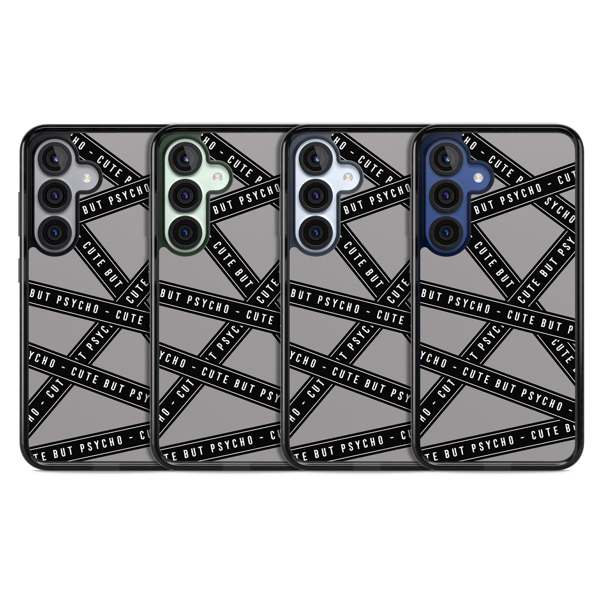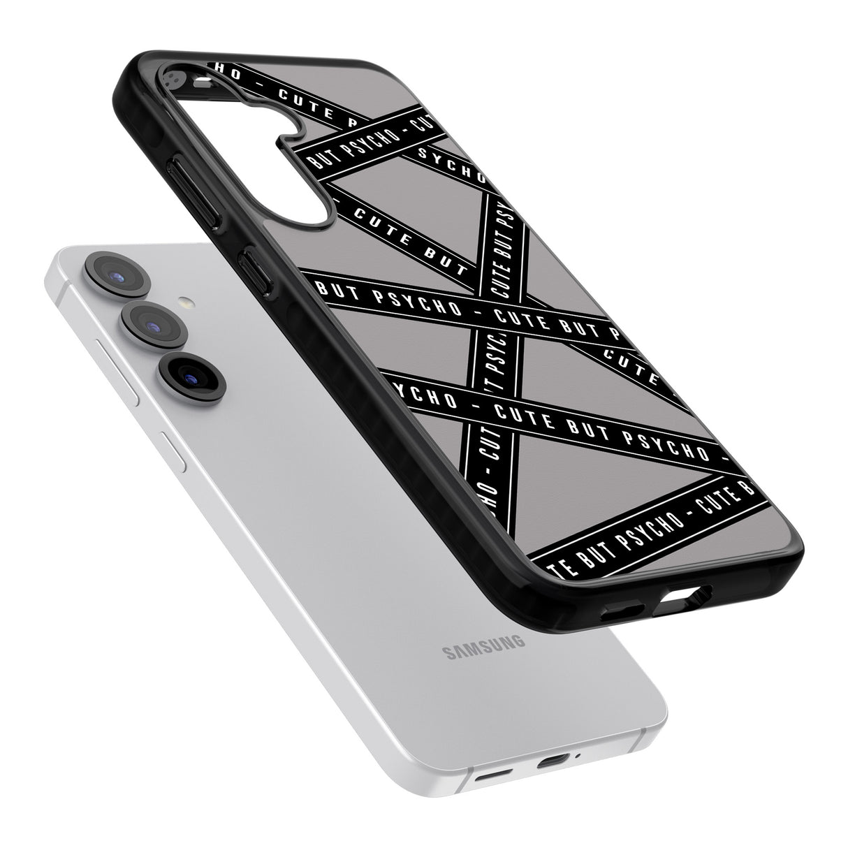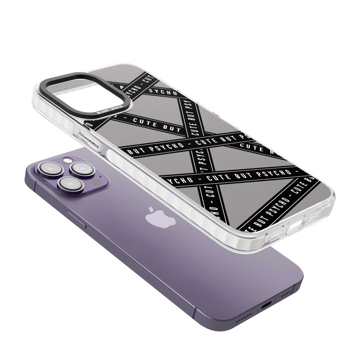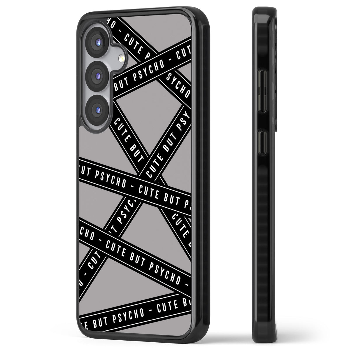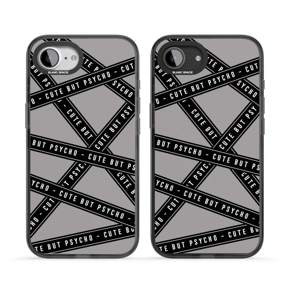 This phone case features a bold design with overlapping black caution tape patterns that read "Cute But Psycho" against a sleek background. Compatible with iPhone and Samsung models, it's crafted for durability while ensuring your personal style shines through. Ideal for those who love to make a statement, this case offers protection with personality, blending edgy aesthetics with practical functionality. Stand out and express yourself while keeping your phone safe and stylish.