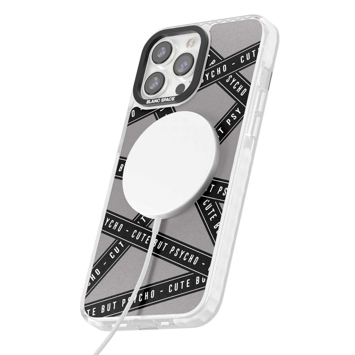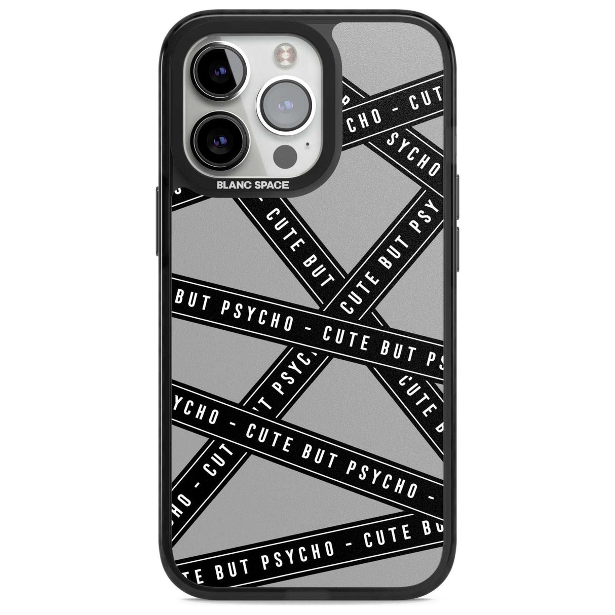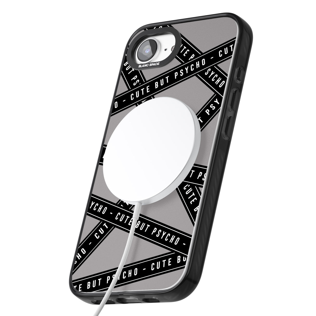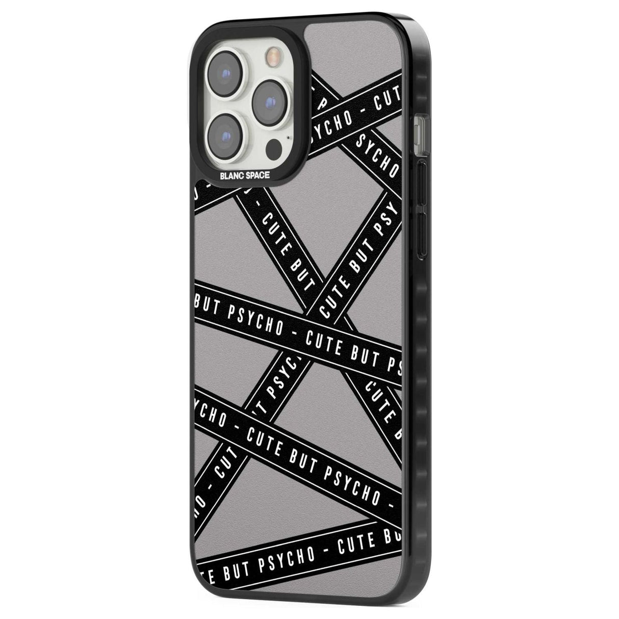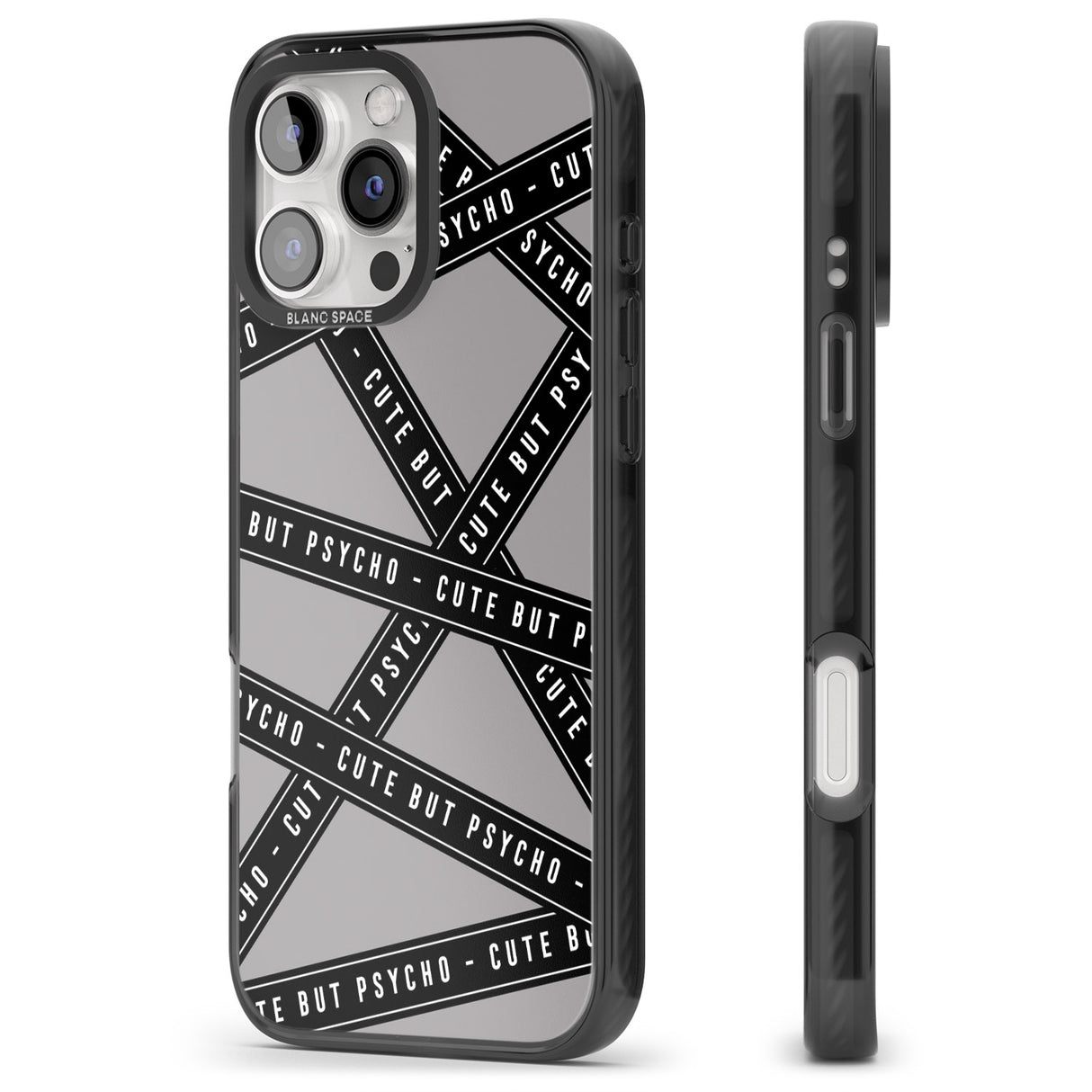 This phone case features a bold design with overlapping black caution tape patterns that read "Cute But Psycho" against a sleek background. Compatible with iPhone and Samsung models, it's crafted for durability while ensuring your personal style shines through. Ideal for those who love to make a statement, this case offers protection with personality, blending edgy aesthetics with practical functionality. Stand out and express yourself while keeping your phone safe and stylish.