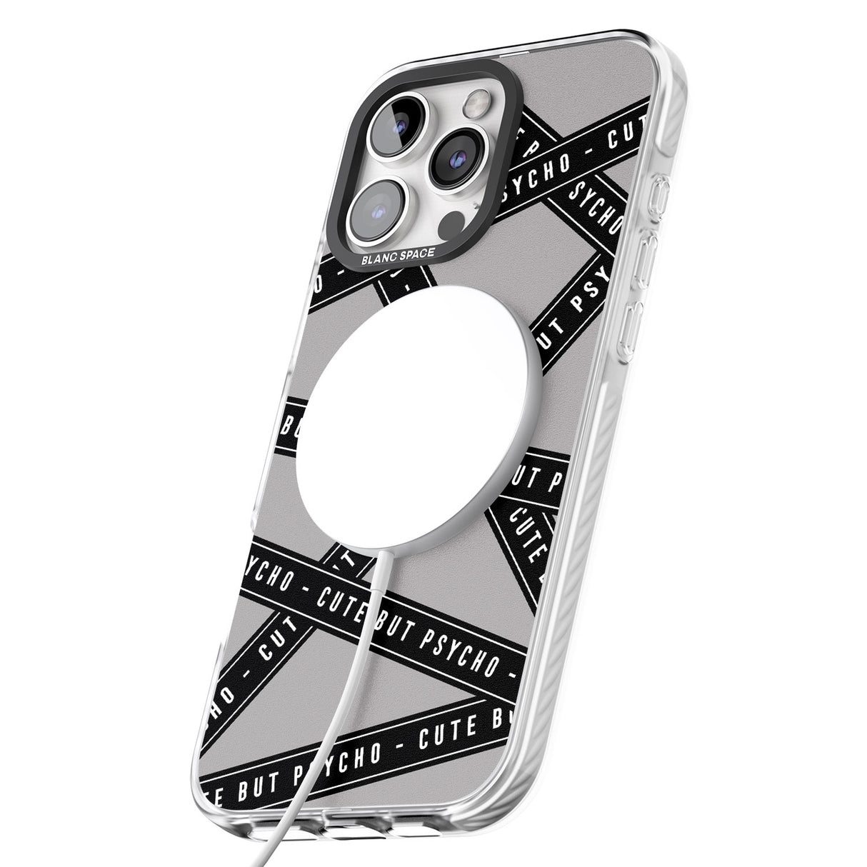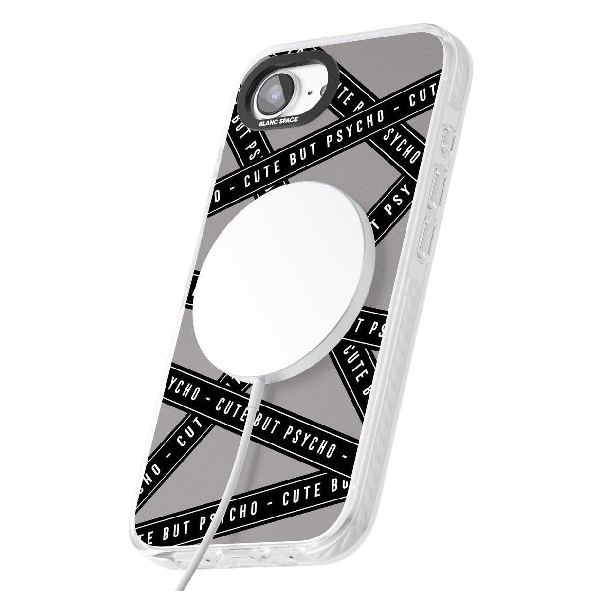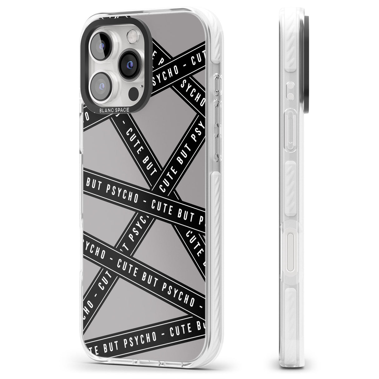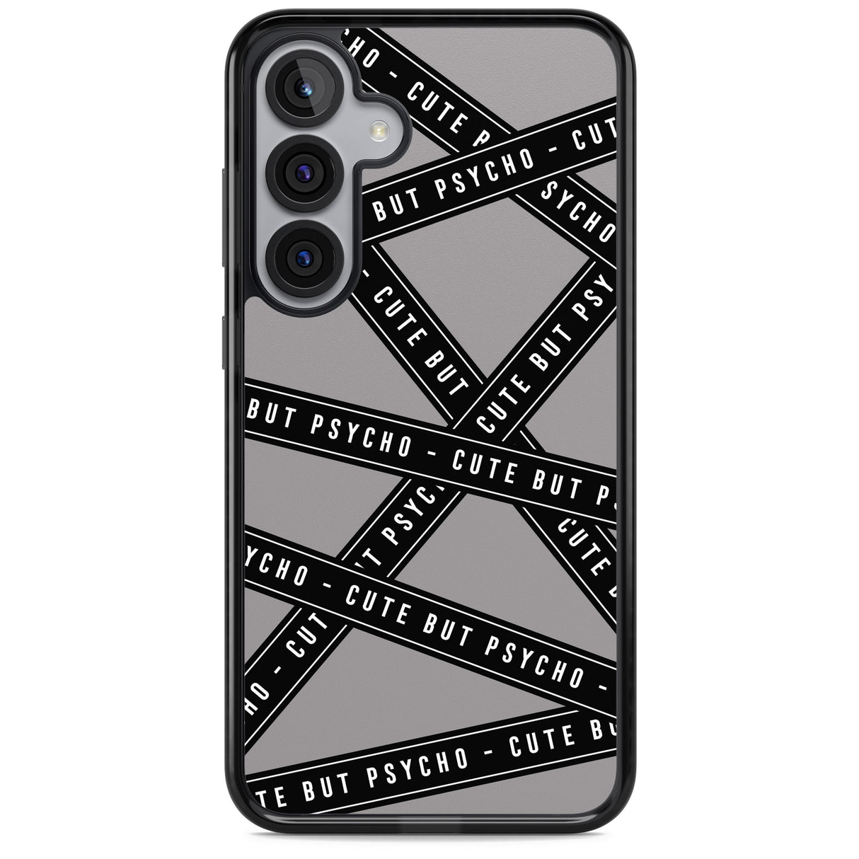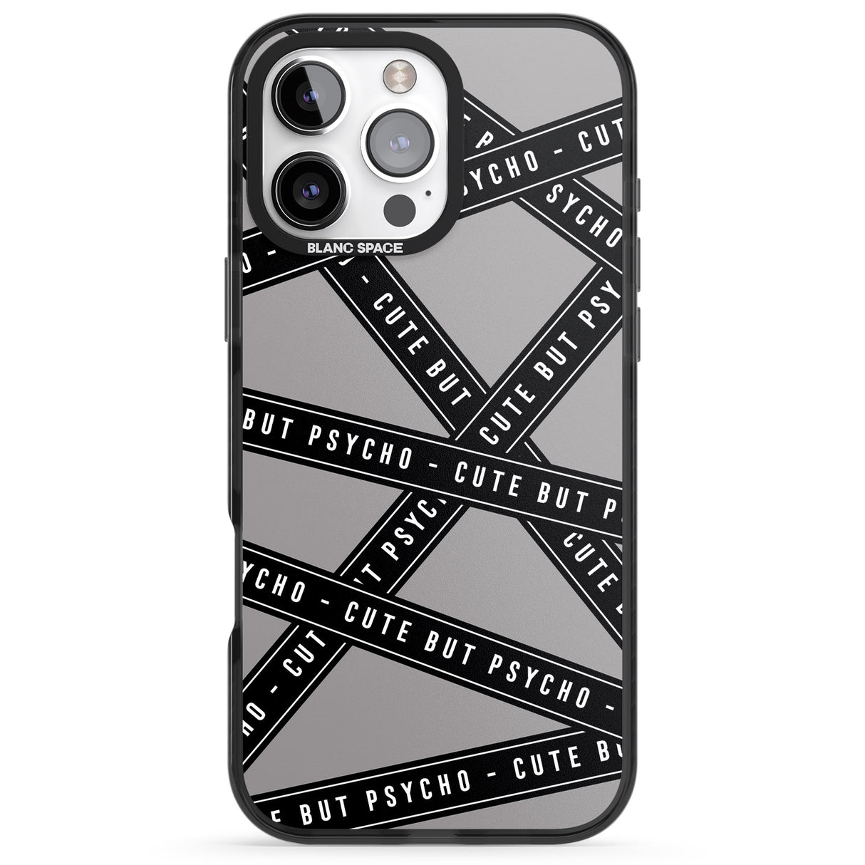 This phone case features a bold design with overlapping black caution tape patterns that read "Cute But Psycho" against a sleek background. Compatible with iPhone and Samsung models, it's crafted for durability while ensuring your personal style shines through. Ideal for those who love to make a statement, this case offers protection with personality, blending edgy aesthetics with practical functionality. Stand out and express yourself while keeping your phone safe and stylish.