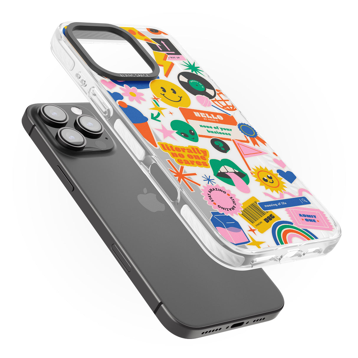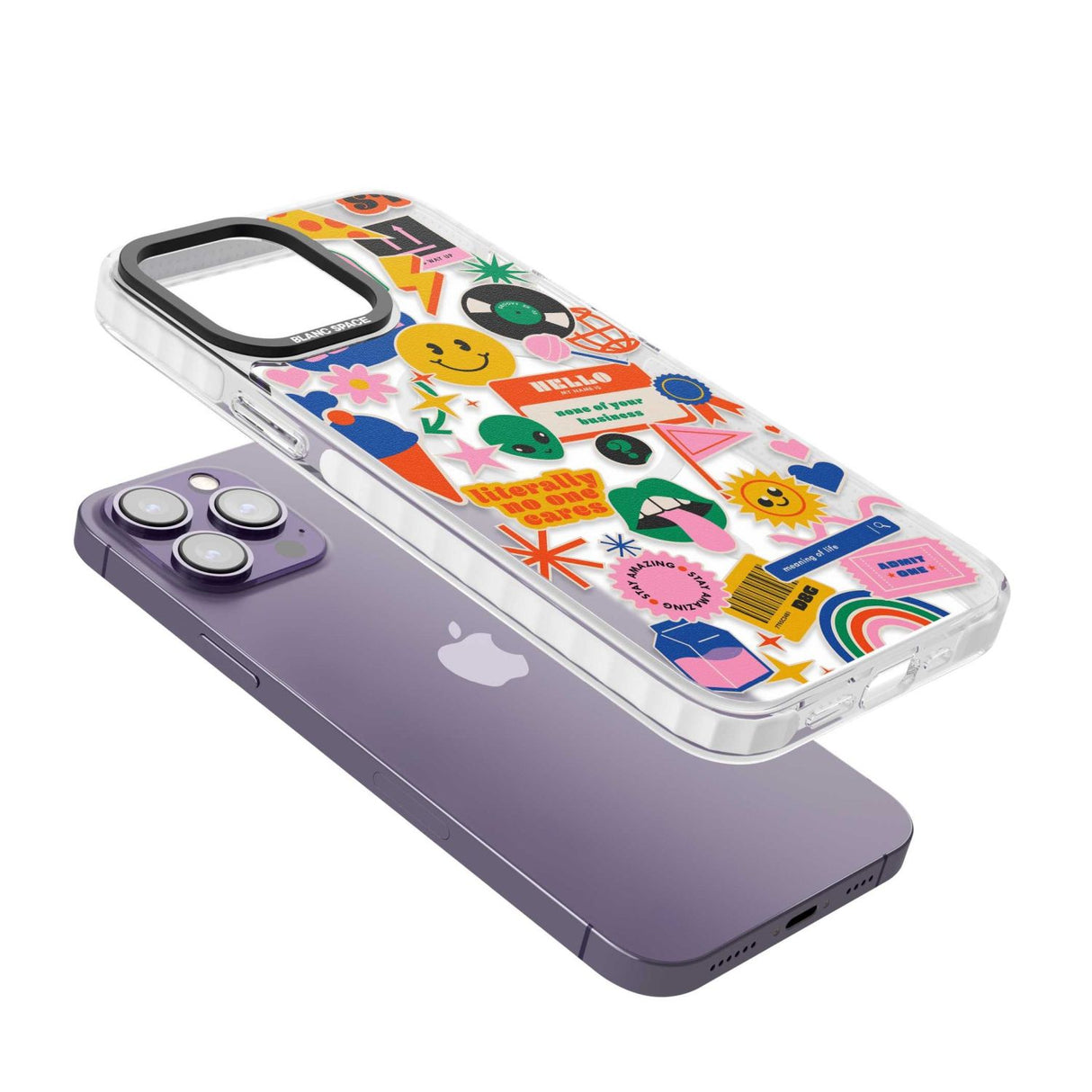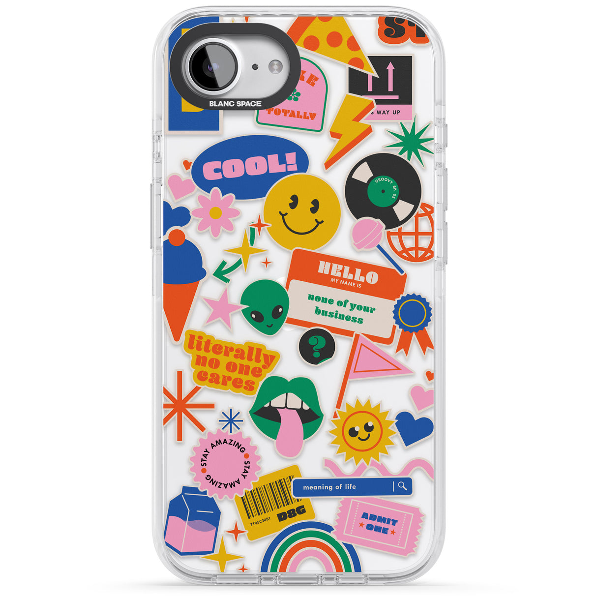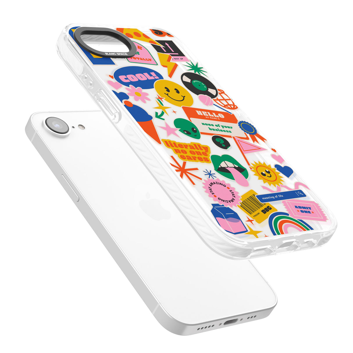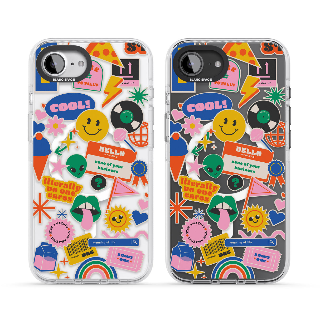 Unleash your playful side with this vibrant phone case that's bursting with nostalgic stickers, from smiling suns to quirky aliens. Feel confident and expressive with each glance at your phone. Your Phone, Your Way.