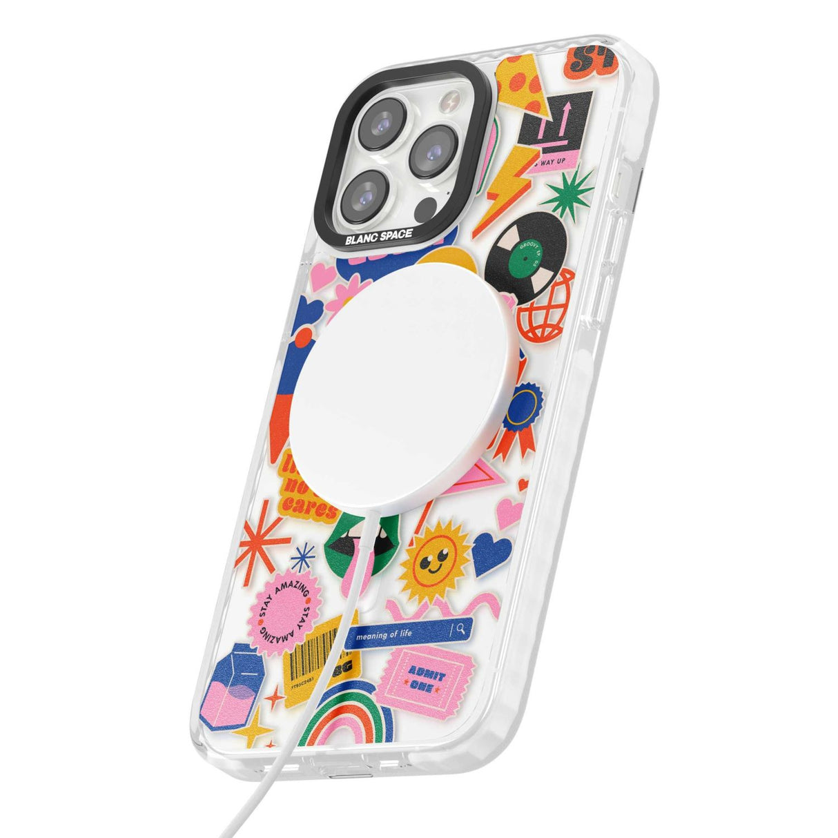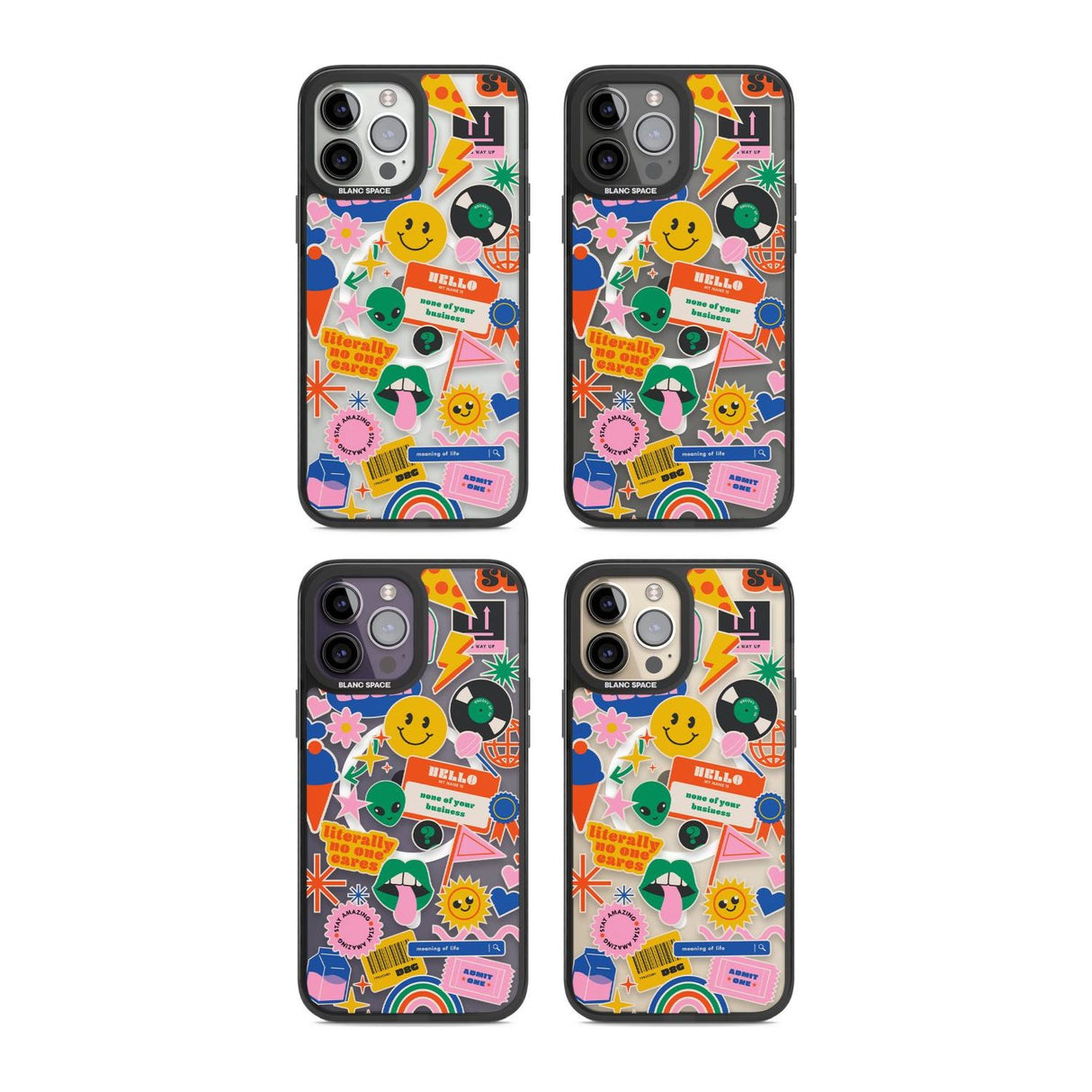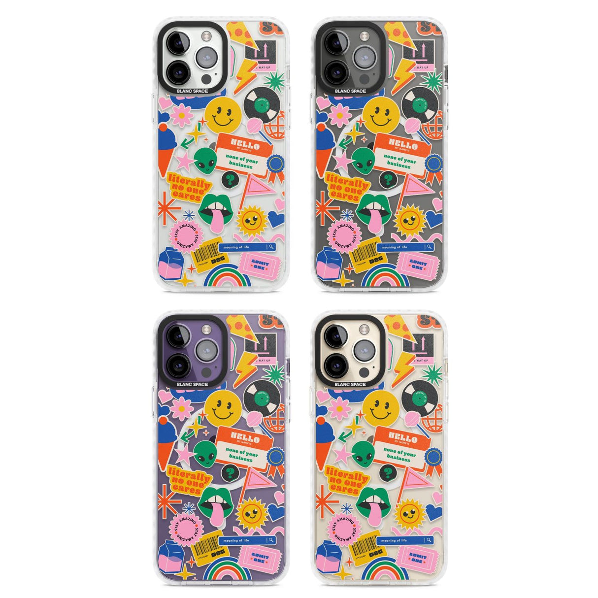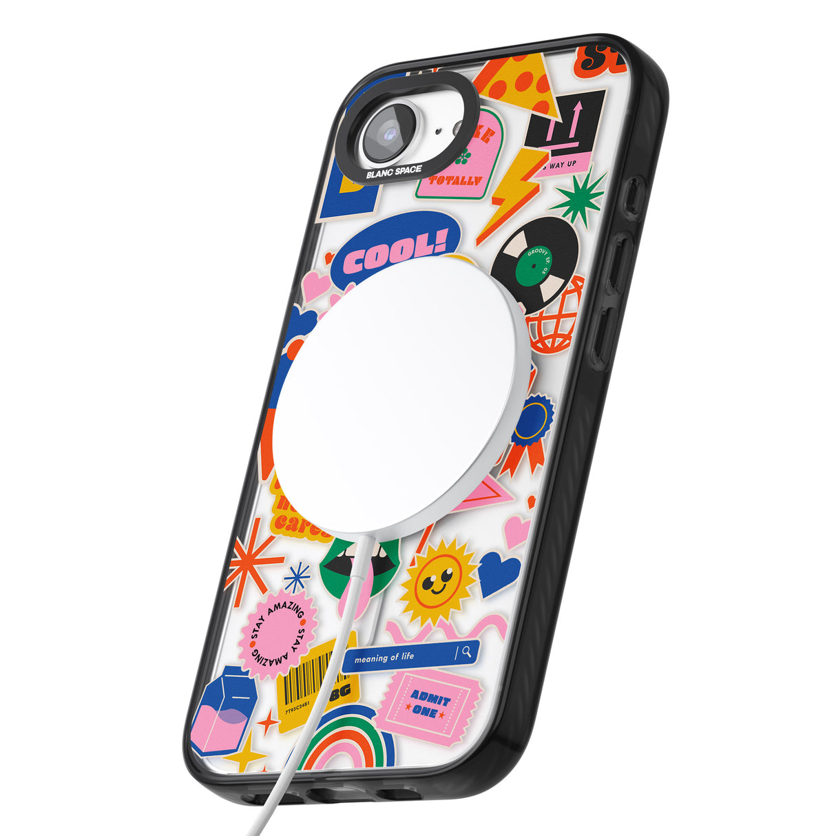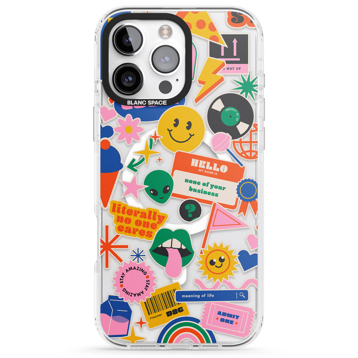 Unleash your playful side with this vibrant phone case that's bursting with nostalgic stickers, from smiling suns to quirky aliens. Feel confident and expressive with each glance at your phone. Your Phone, Your Way.