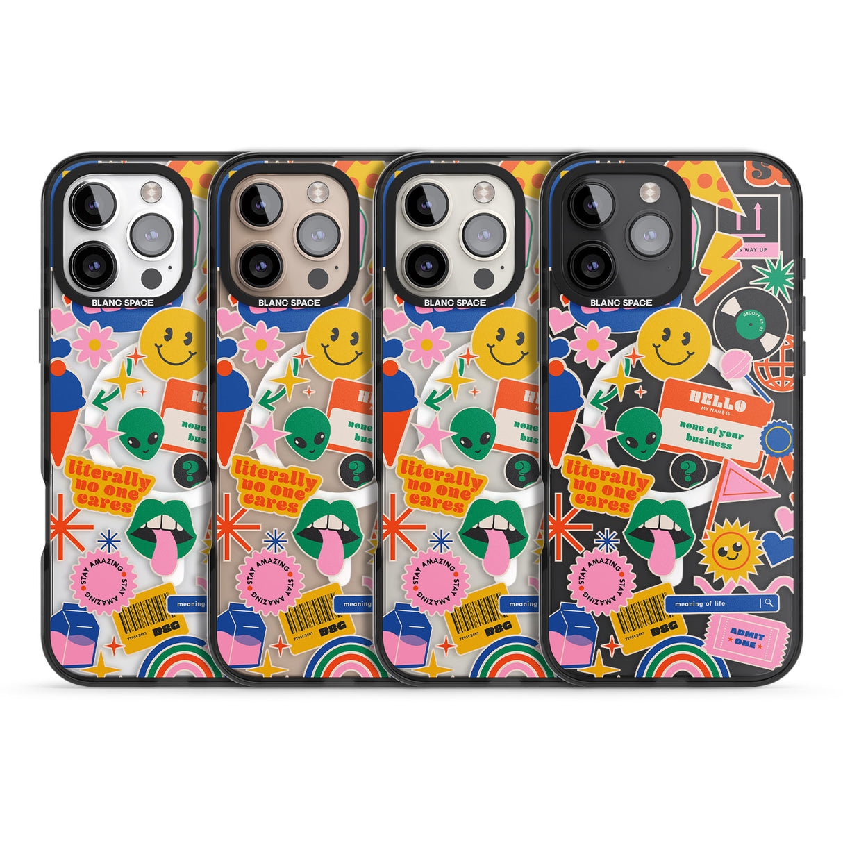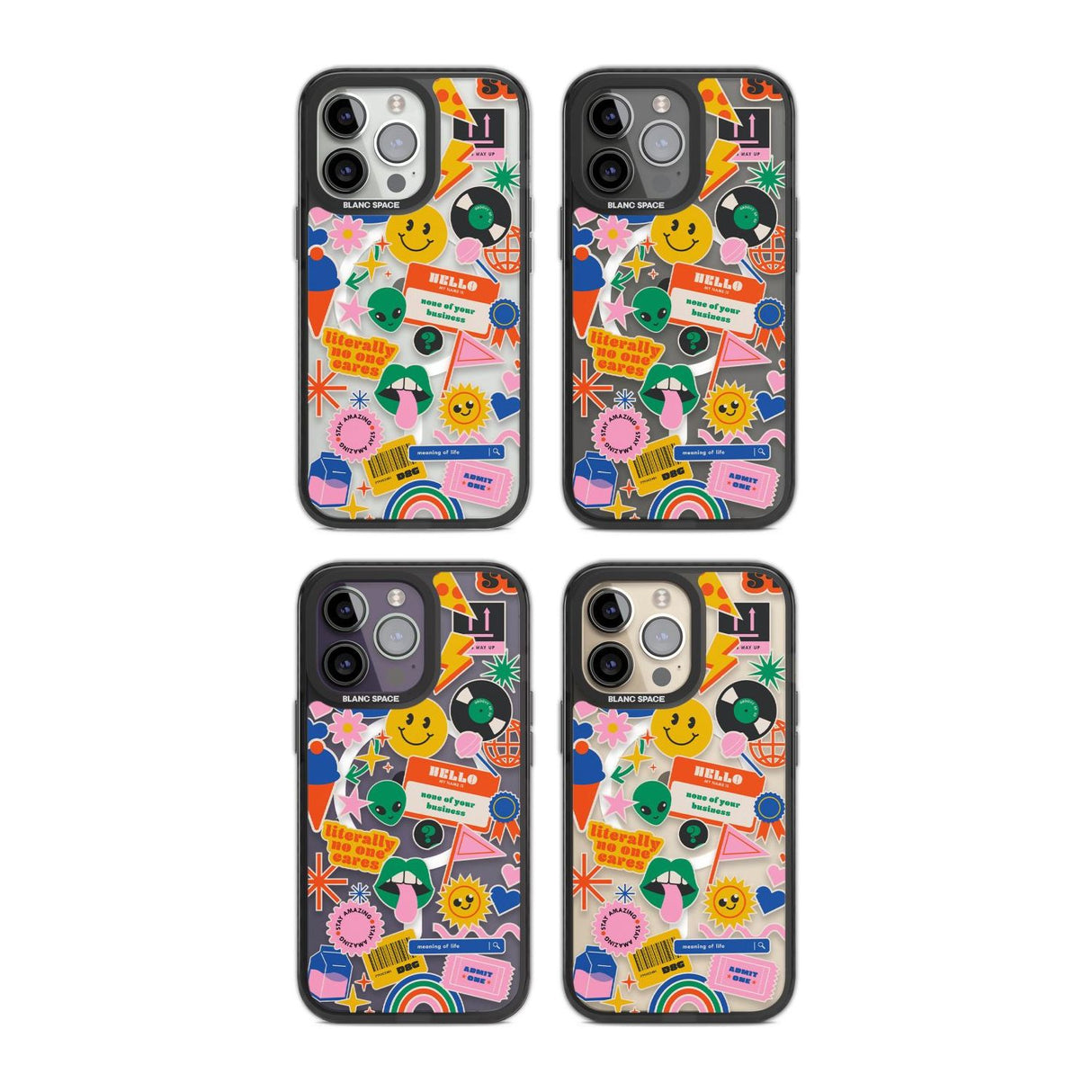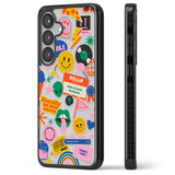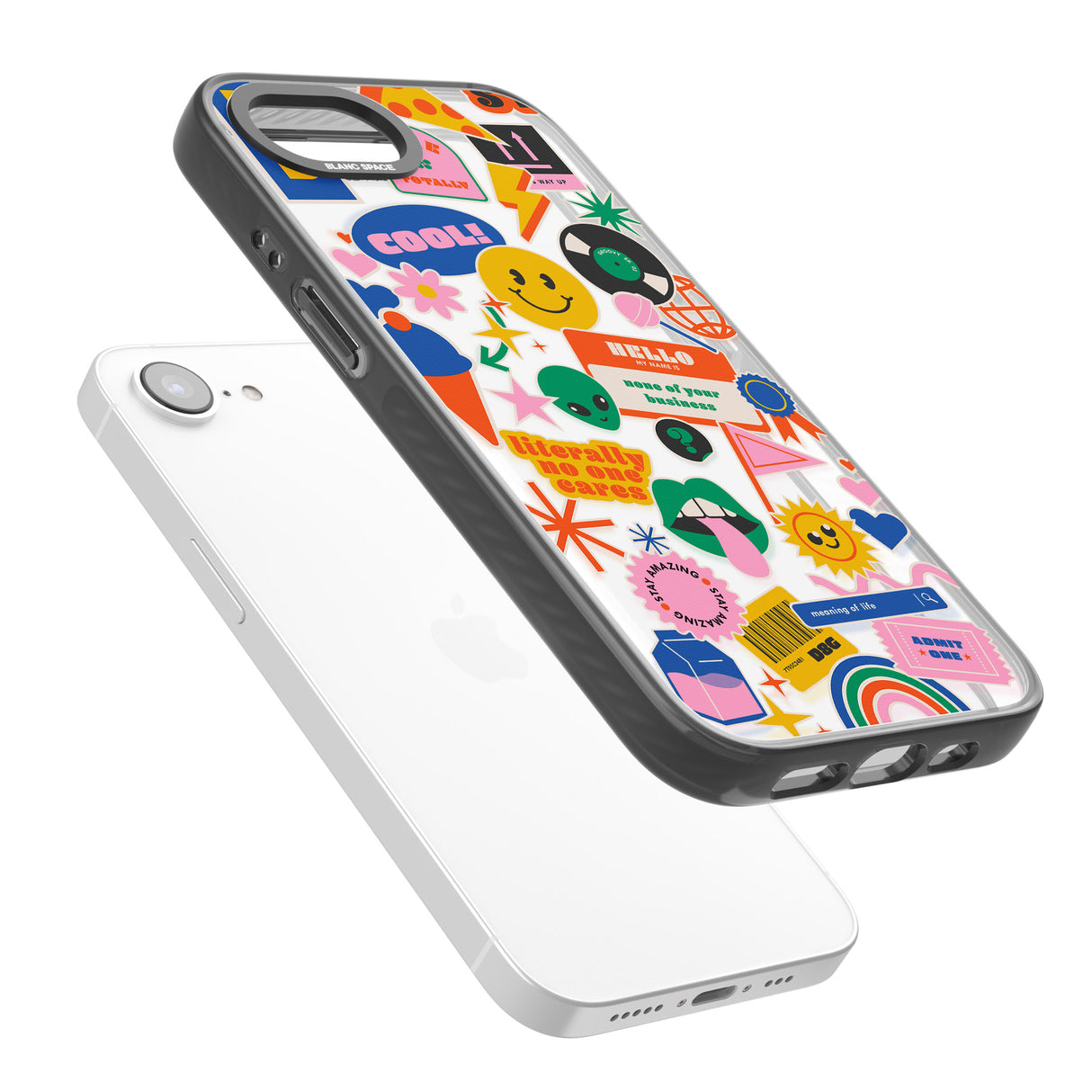 This phone case showcases a collage of colorful, nostalgic stickers that bring a playful, retro vibe to your device. Designed for both iPhone and Samsung models, it allows personal expression while ensuring reliable protection. Inspired by 90s nostalgia, the design features classic motifs like smiley faces, bold text, and whimsical icons. The case ensures your phone is protected in style, merging fun aesthetics with sturdy construction.