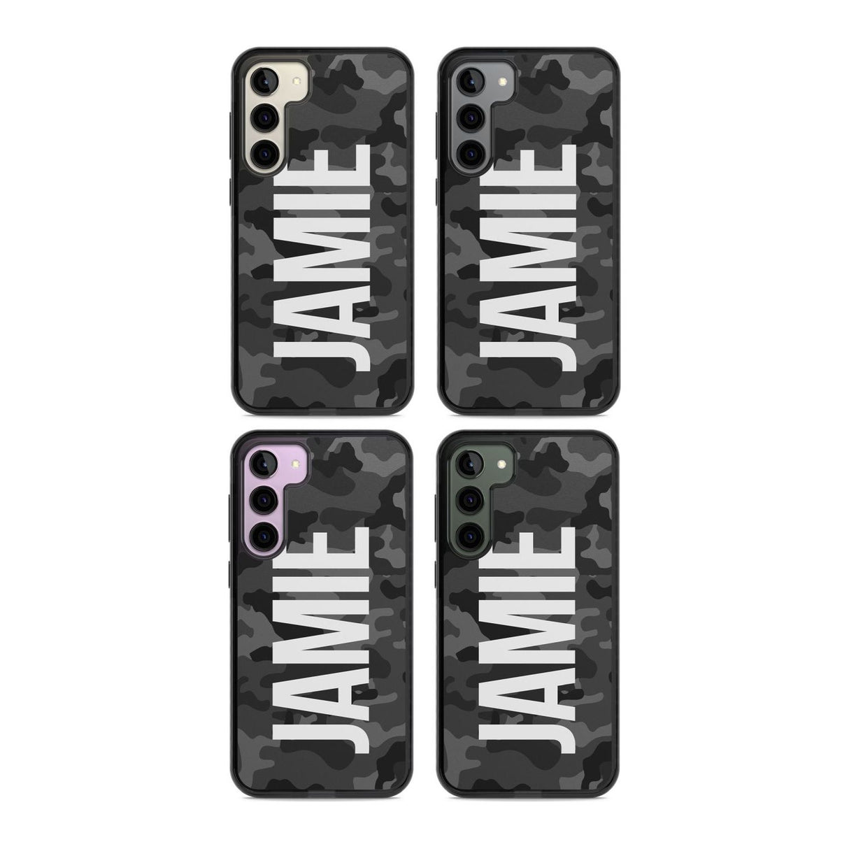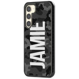 This phone case features a dark black and grey camouflage pattern with a bold vertical name print in large white block letters, offering a high-contrast, urban-inspired aesthetic. Designed for those who like a clean, masculine edge with a hint of military cool, this case blends function with confident personal expression. Compatible with all major iPhone and Samsung models, it offers full coverage protection while letting your name take center stage. Whether you're snapping mirror selfies or heading out, this case delivers personality, edge, and everyday durability. The design leans into personalization with a monochrome palette and sharp lines, perfect for the minimalist who still wants to make a statement.